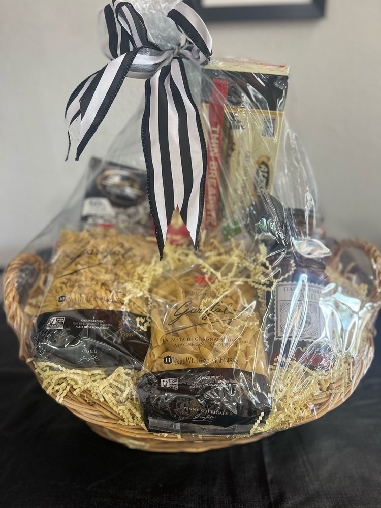 This amazing basket donated from The Fresh Market contains variety of pastas, sauce, parmesan cheese, dark chocolate, and a bottle Dark Horse Red Blend wine. Perfect for an at home Italian date night! (Value: $100)