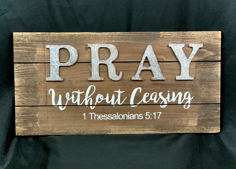 This rustic wall art displays nicely in any family room. Famous words from the Apostle Paul about staying in constant contact with our Heavenly Father. Such a great piece to hang around the house as a constant reminder of Who can solve our problems and where to look. This sign could be yours or used as a wonderful gift for someone that you love. Dimensions: 22''x11''