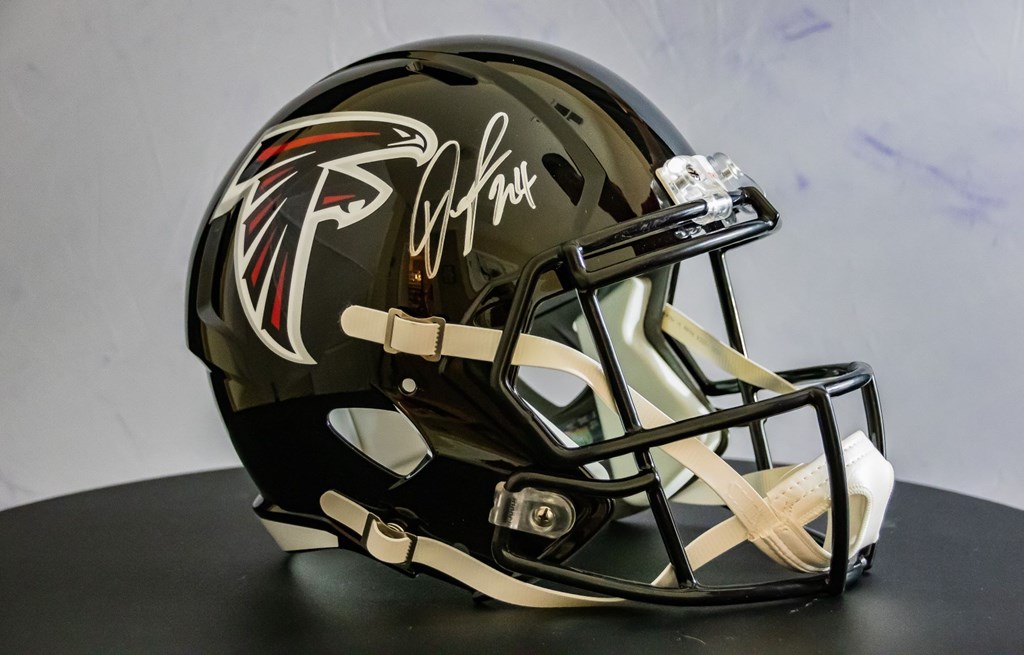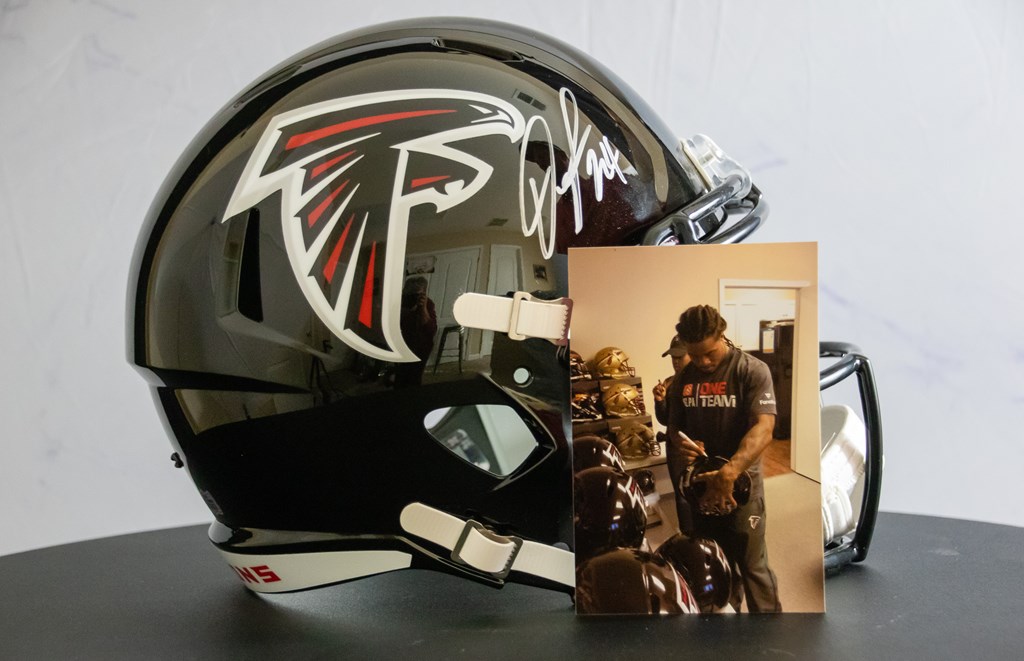NFL fans this one is for you. Beautiful full-sized helmet signed by Devonta Freeman with picture of him signing. Display this in the case that is included and it will set off any man cave or book shelf it sits on.
