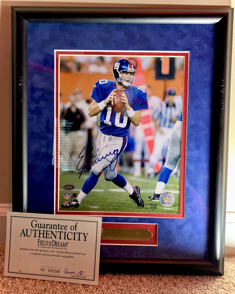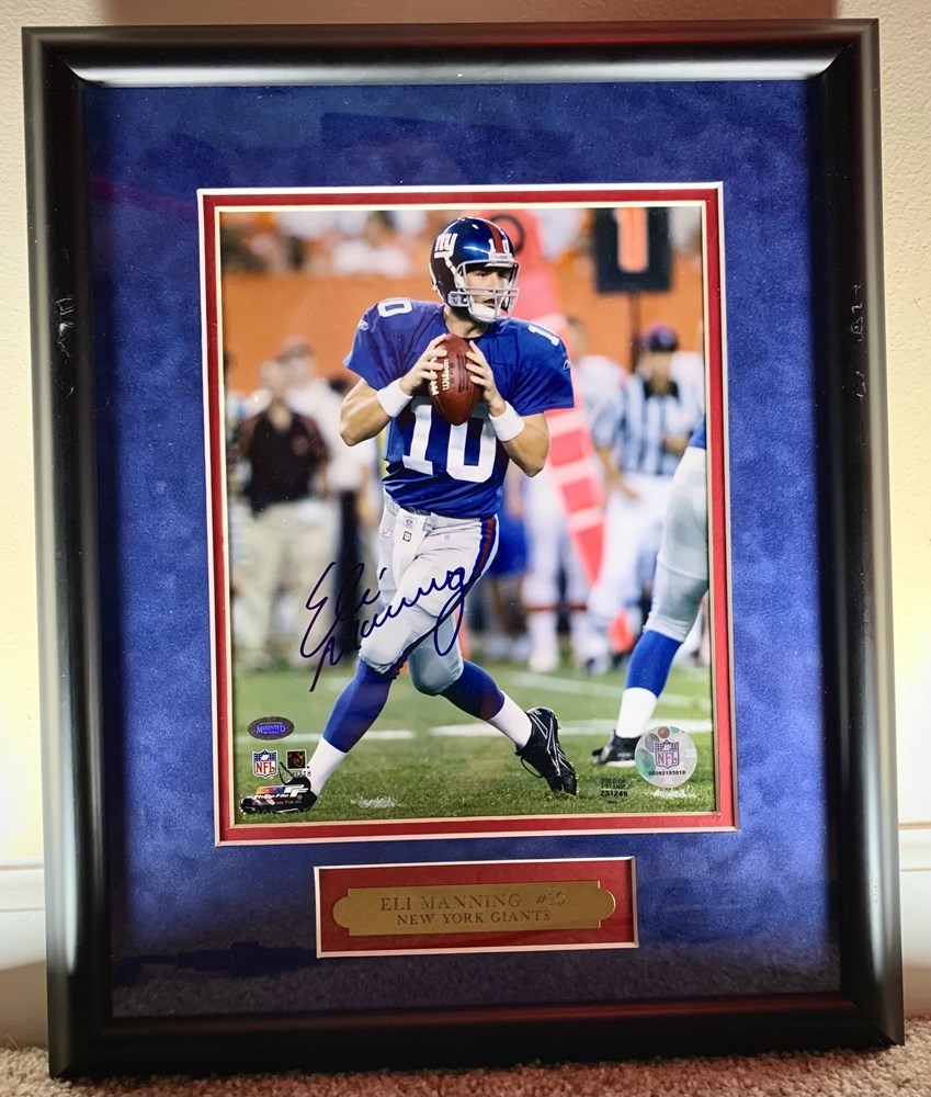 Own this wonderful autographed framed photo of the two-time Super Bowl Champion Quarterback for the New York Giants, Eli Manning. NY Giants fans and fans of all the great NFL players would love to display this piece in their home or office. Comes with a letter of authenticity. Dimensions of picture: 12" x 14.5". Dimensions of outside frame: 14" x 16".