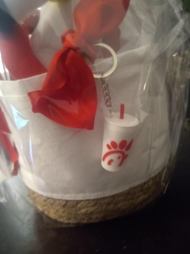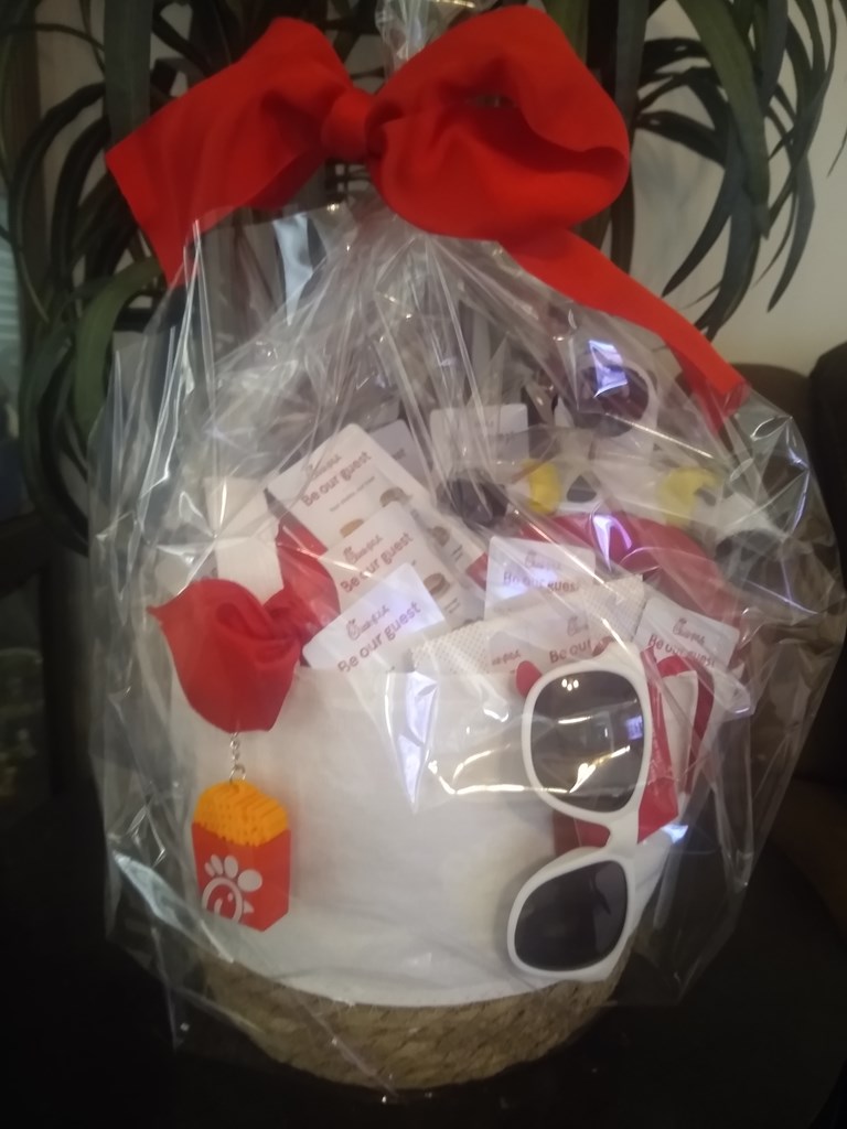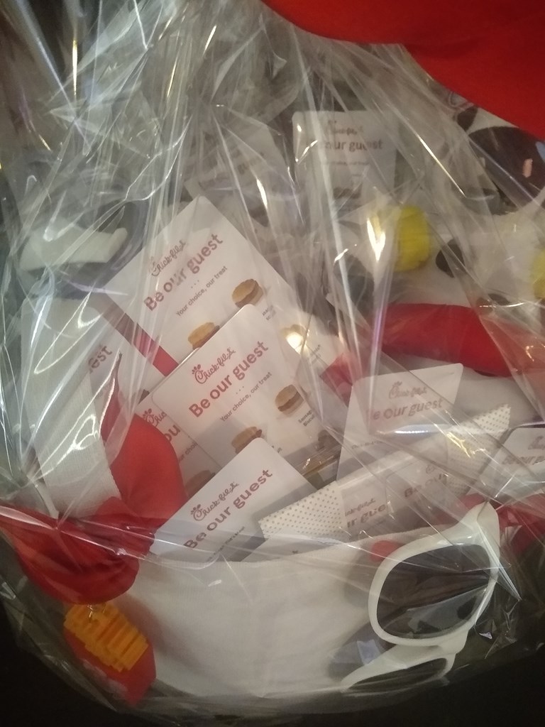 A Basket full of Chick-fil-A, man doesn't that sound good. This basket is full of all your favorite foods, desserts, mints, trinkets and more. Treat your family to Christian Chicken for a little while if you win this item. Package Includes: Several gift cards for breakfast, lunch/dinner and dessert A Chick-fil-A Tumbler Cup A Cow teddy Key chains Mints And more $125 value