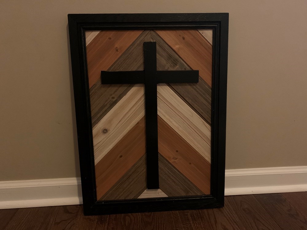 This is a handmade wooden cross wall hanging with a chevron design background.